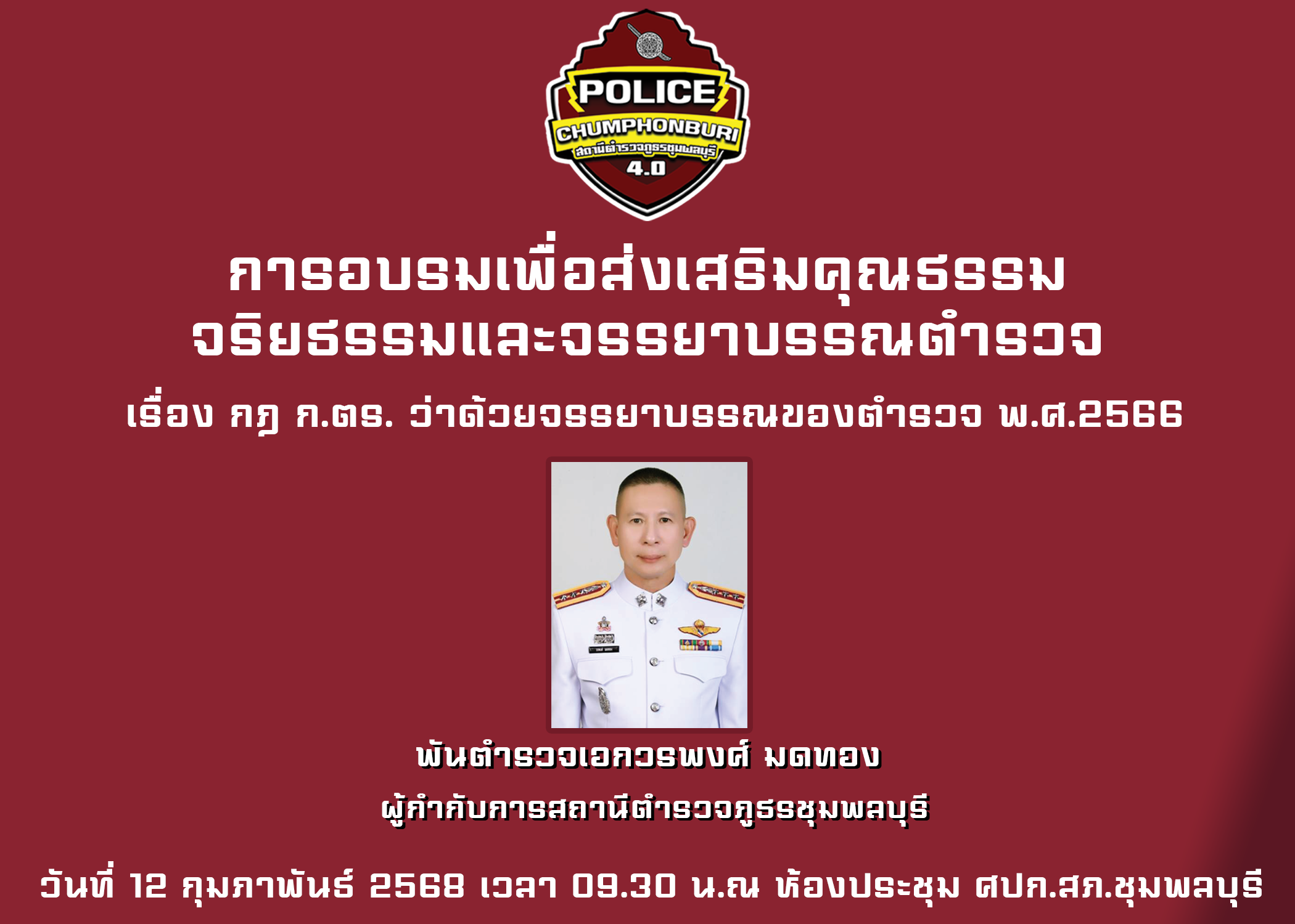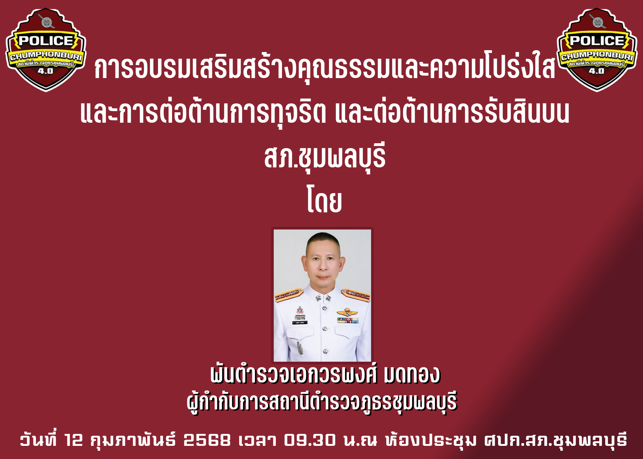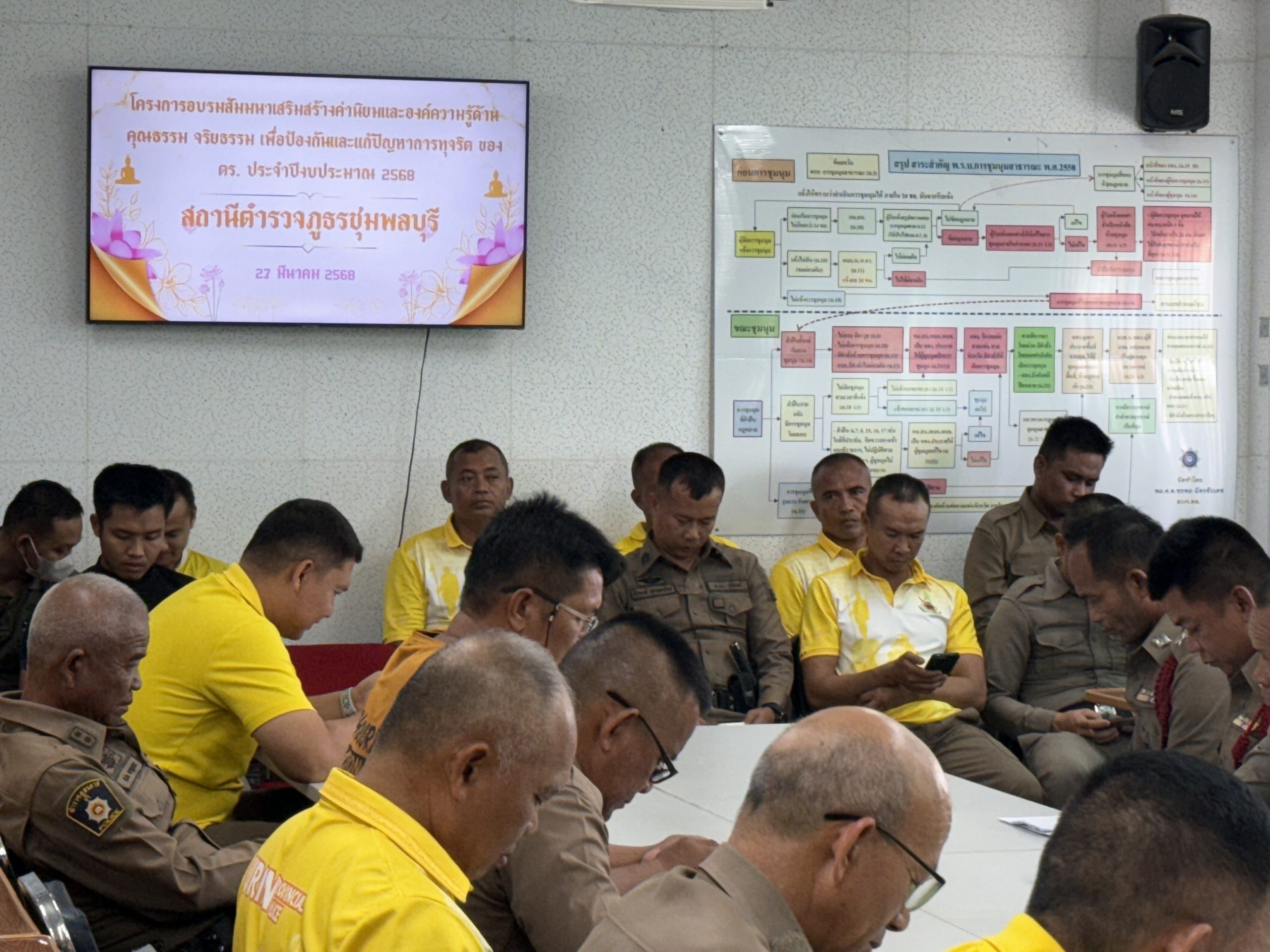 พ.ต.อ.วรพงศ์ มดทอง ผกก.สภ.ชุมพลบุรี ประชุมชี้แจงเสริมสร้างความรู้ความเข้าใจให้เจ้าหน้าที่ในการจัดการทรัพย์สินของราชการ ของบริจาค และการจัดเก็บของกลางเพื่อป้องกันการทุจริตภายในหน่วยงาน พร้อมด้วยการดำเนินปรับปรุงสถานที่จอดรถของกลางในคดี