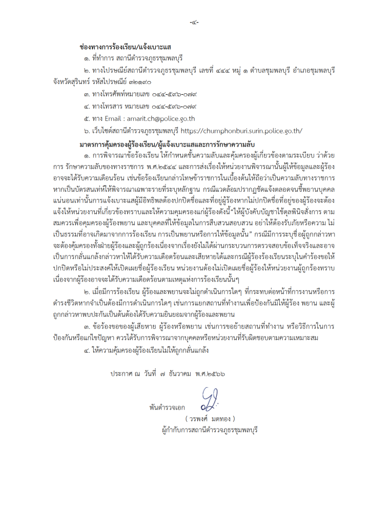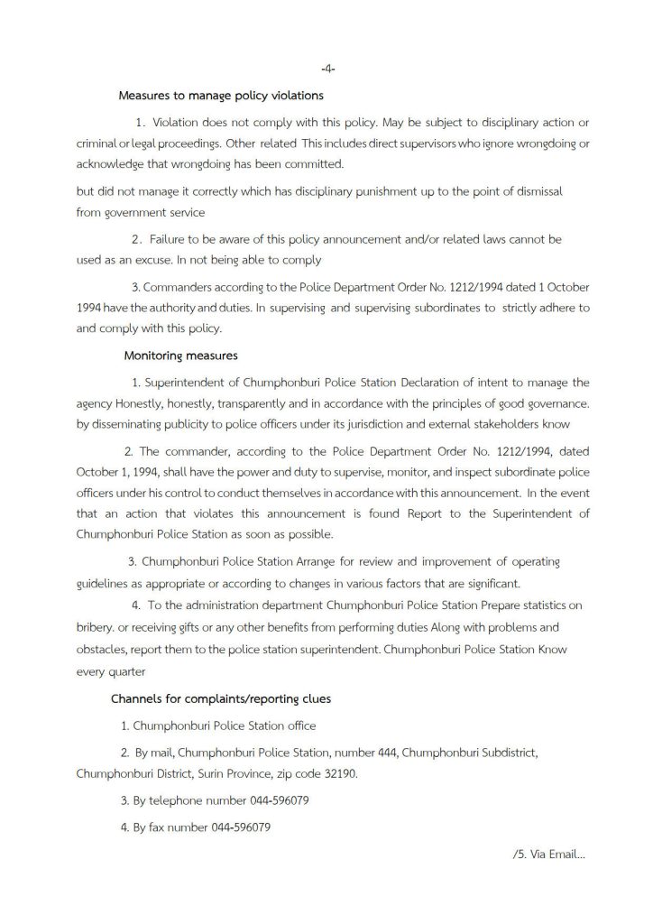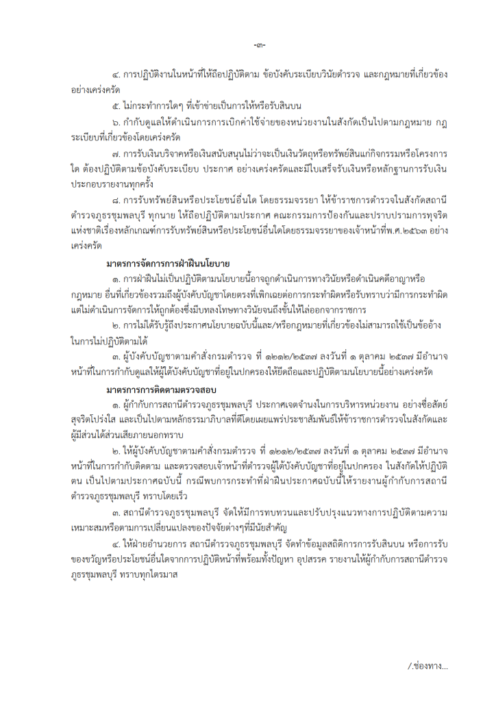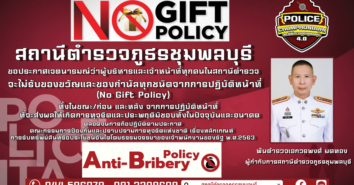 พ.ต.อ.วรพงศ์ มดทอง ผกก.สภ.ชุมพลบุรี ประชุมชี้แจงแจ้งประกาศของสถานีเรื่องการต่อต้านการรับสินบนและไม่รับของขวัญและของกำนัลของหน่วย 30 มกราคม 2025 โดย chumphonburi_amarit / การมีส่วนร่วมของหัวหน้าสถานี วันที่ 30 มกราคม 2568 เวลา 14.00 น. พ.ต.อ.วรพงศ์ มดทอง ผกก.สภ.ชุมพลบุรี ประชุมบริหารประจำเดือนของหน่วย แจ้งประกาศของสถานีตำรวจชุมพลบุรี เรื่อง นโยบายต่อต้านการรับสินบน (Anti-Bribery Policy) และนโยบายไม่รับของขวัญและของกำนัลทุกชนิด (No Gift Policy) จากการปฏิบัติหน้าที่ เพื่อให้ข้าราชการตำรวจในสังกัด สถานีตำรวจภูธรชุมพลบุรีทุกนาย รับทราบและนำไปถือปฏิบัติโดยเคร่งครัด