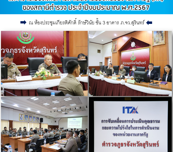 พล.ต.ต.สุคนธ์ ศรีอรุณ ผบก.ภ.จว.สุรินทร์, พ.ต.อ.ศิราเมษฐ์ ธานินพิทักษ์ รอง ผบก.ภ.จว.สุรินทร์, พ.ต.ท.สุรชัย ชัญถาวร รอง ผกก.ฯ ปรก.ฝอ.ภ.จว.สุรินทร์ พร้อมด้วยเจ้าหน้าที่ที่เกี่ยวข้อง ร่วมประชุมการดำเนินการประเมินคุณธรรมและความโปร่งใสในการดำเนินงานของหน่วยงานภาครัฐ (ITA) ของสถานีตำรวจ ประจำปีงบประมาณ พ.ศ.2567