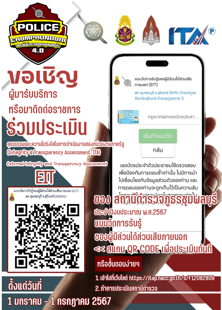 สภ.ชุมพลบุรี ขอเชิญชวนประชาชน หรือผู้เคยมาติดต่อราชการ สภ.ชุมพลบุรี ร่วมทำแบบประเมิน วัดการรับรู้ของบุคคลผู้มีส่วนได้ส่วนเสียภายนอก 1 มกราคม 2024 โดย chumphonburi_amarit / ข่าวประชาสัมพันธ์,ข่าวกิจกรรม,ข่าวประชาสัมพันธ์,ข่าวฝากประชาสัมพันธ์,ไม่มีหมวดหมู่ สภ.ชุมพลบุรี ขอเชิญชวนประชาชน หรือผู้ที่เคยมาติดต่อราชการ สภ.ชุมพลบุรี ร่วมทำแบบประเมิน วัดการรับรู้ของบุคคลผู้มีส่วนได้ส่วนเสียภายนอก EIT ได้ที่ https://itap.nacc.go.th/s/F12082809 หรือสแกน QR CODE