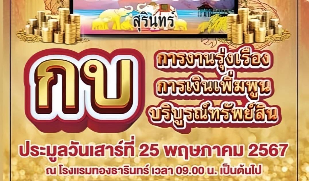สำนักงานขนส่งจังหวัดสุรินทร์ ขอเชิญผู้สนใจร่วมประมูลทะเบียนรถเลขสวยๆ 301 หมายเลข สำหรับรถยนต์ส่วนบุคคลไม่เกิน 7 ที่นั่ง(รถเก๋ง,รถสี่ประตู) หมวดอักษร กบ “การงานรุ่งเรือง การเงินเพิ่มพูน บริบูรณ์ทรัพย์สิน” ประมูลวันเสาร์ที่ 25 พฤษภาคม 2567 เวลา 09.00 น.เป็นต้นไป ณ โรงแรมทองธารินทร์